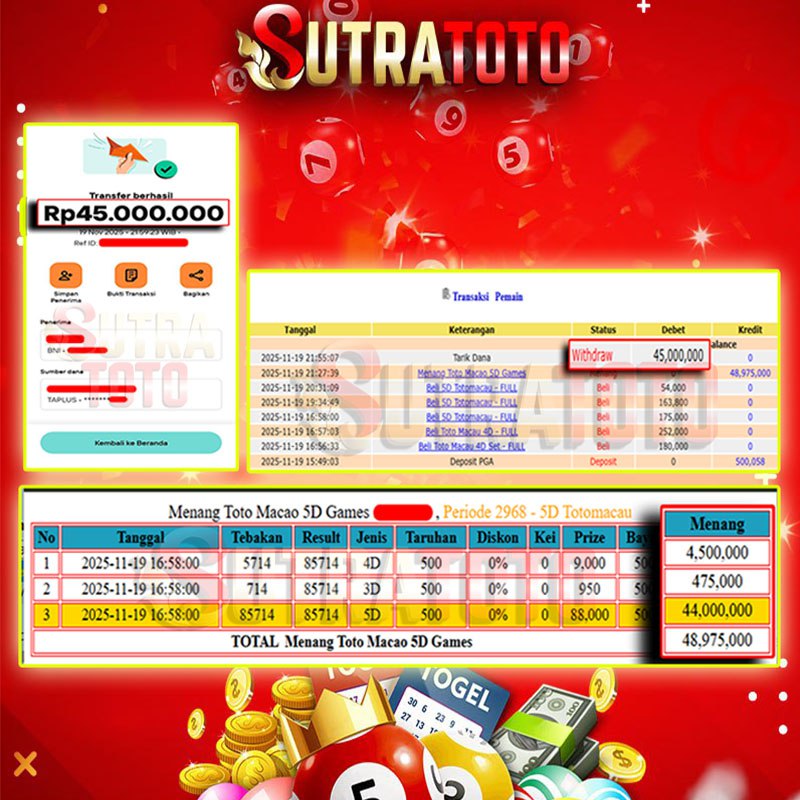 SUTRATOTO JACKPOT TOTO MACAO 5D GAMES Rp. 45.000.000,- LUNAS