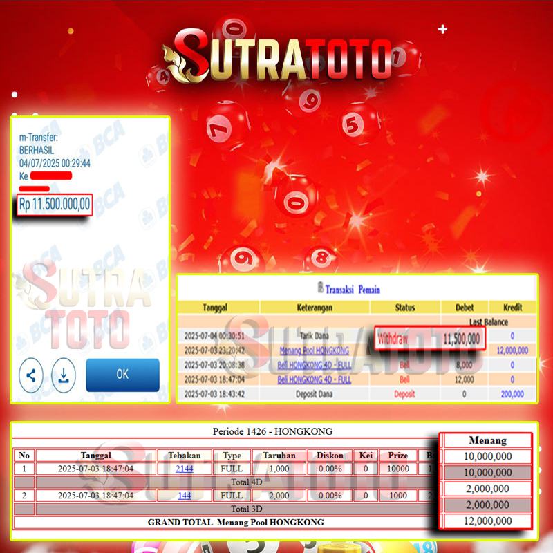 SUTRATOTO JACKPOT HONGKONG LOTTO Rp. 111.000.000,- LUNAS
